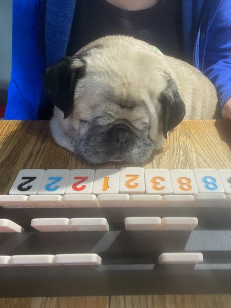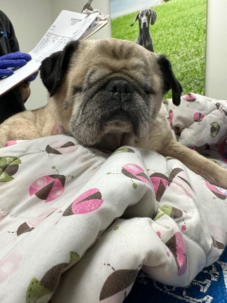 Out of the blue one day, we got a call to let us know we had a flight angel!! A friend of a friend had to fly to Cali for work and had no problems bringing back a dog for us. That is a true gift and we contacted Pug Nation to see if there was anyone they had in mind for us. A picture of Cecelia came through our email and we knew she was the perfect senior lady. She arrived in Dec and fit in wonderfully with everyone, both human and k-9. We don’t know if it’s the pressure or elevation change, but similar to Ruthie, her eye started to pressure up as well. During the week between Christmas and New Year’s, she had an appointment to have her eye removed. While she was under, she was not doing well on the anesthetic. They checked her other eye and deemed it would have to come out sooner or later and not wanting to put her under anaesthetic again, they took both. There was such a huge difference in our new CeCe! We wondered just how much pain she was in. seeing her tail wag was heartwarming and unlike before we couldn’t get her to sit down. It's obvious she adjusted very well to her new life and was a very happy lady. Almost exactly one year to the day that we brought her home, she was put outside with everyone for morning pees. Five minutes later, the door opened, and everyone ran in…. Except for Cecilia, who had collapsed on the deck. Kasey and Jayden raced her to the vet only to have her pass in Jayden‘s arms on the way.