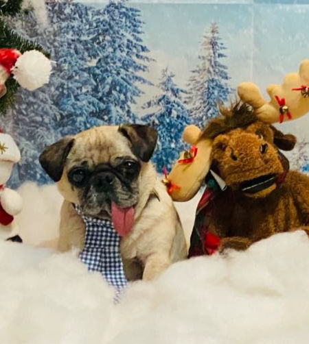 There was a sweet old man named Elvis at the shelter who was living on borrowed time. While Deven was in the air on the way to Pug Nation to bring him home he passed away. There were some quick decisions to be made with a 24-hour turnaround and Cosmo fit the bill! Deven returned with the goofiest little man ever! He was with us for three more years, but not without worsening physical ailments. His front end also seized up and He had to be spoon-fed the last year, but you would never guess there was anything wrong. He loved his handful of stuffies, when he barked, his ears bounced up and down and you could always count on him to start a howl! In November, he started to decline and we moved him from palliative care to hospice. As always, if it’s a possibility, we always try to spend one last Christmas together, but Cosmo had a different plan, and on the 21st of December he passed away in Kasey’s arms after breakfast. You beat the odds and we got to love you for three years.